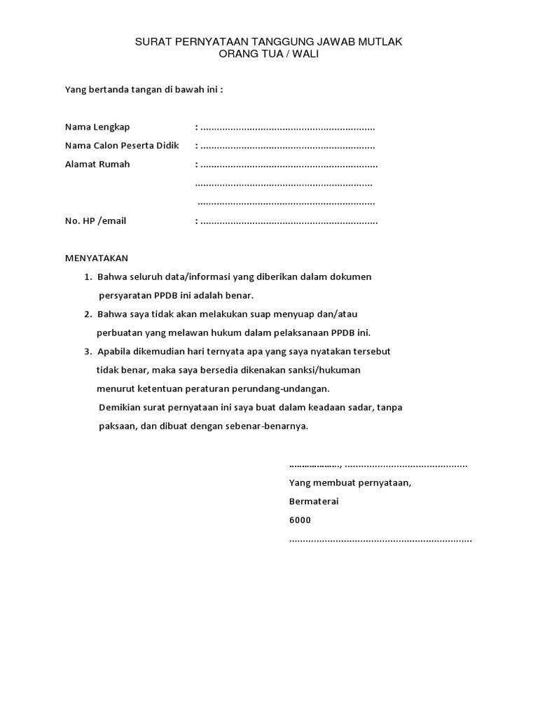 Ditulisan kali ini admin akan berbagi format surat pernyataan tanggungjawab mutlak orang tua, barangkali ada diantara pengunjung web ini memerlukannya untuk . Surat pernyataan tanggung jawab mutlak (sptjm); Yang bertanda tangan di bawah ini : Apabila di kemudian hari terbukti pernyataan saya tersebut tidak. Surat tugas pindah orang tua / wali;